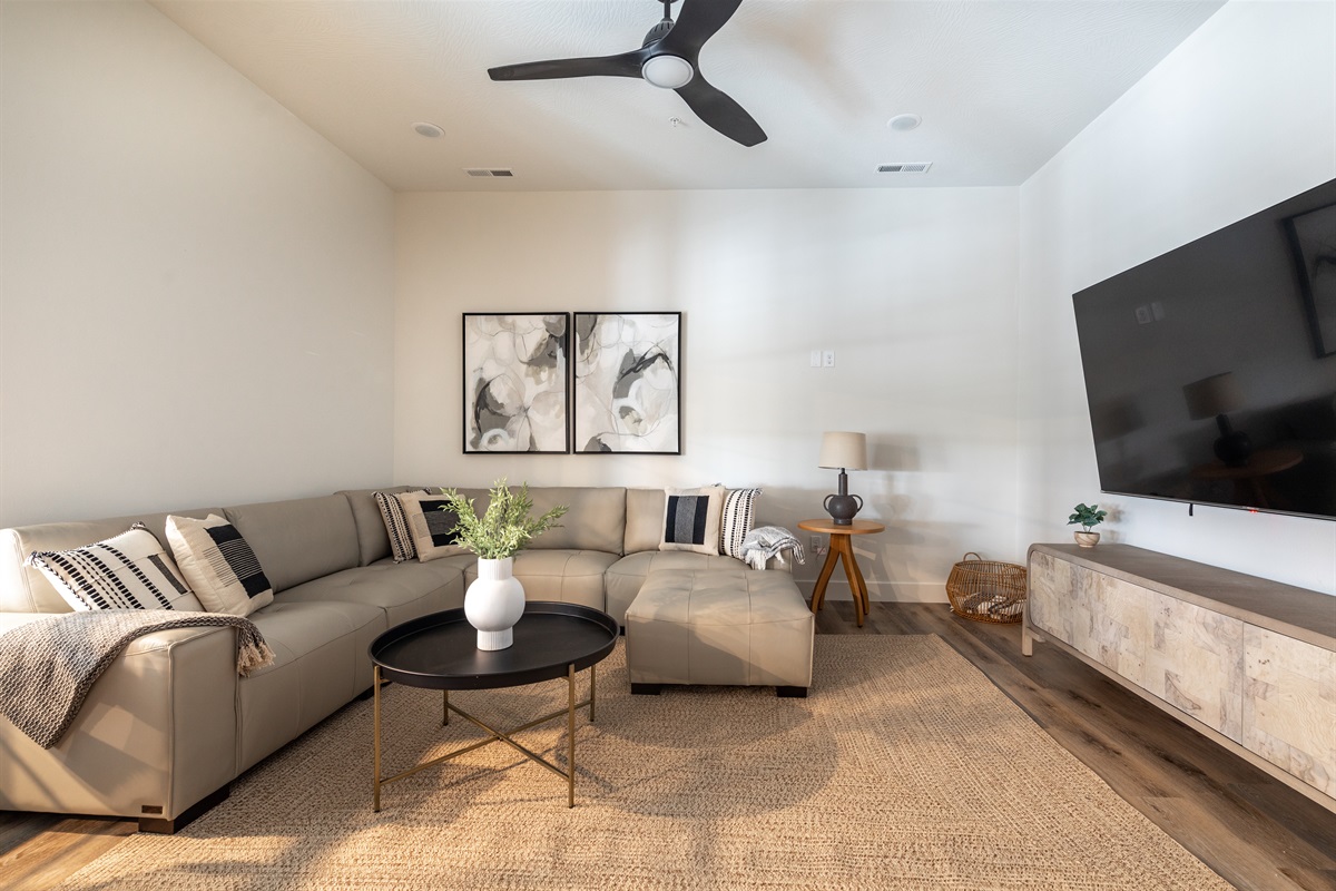 • Open-concept main living room with comfortable seating and Smart TV