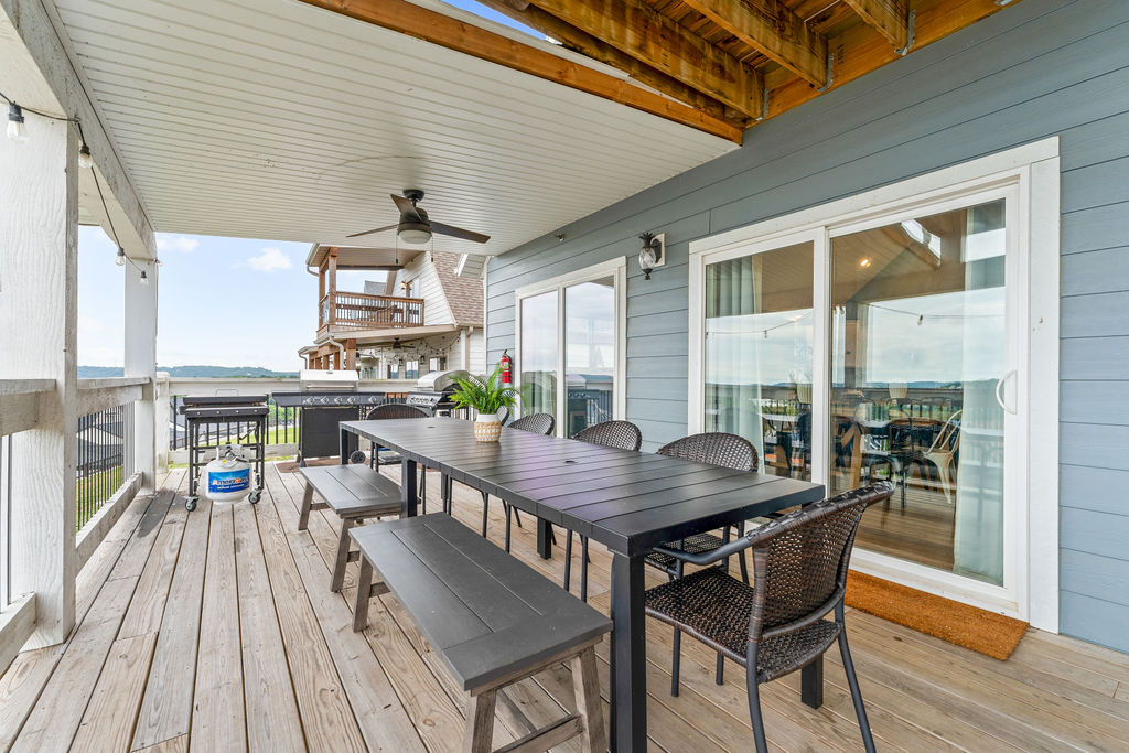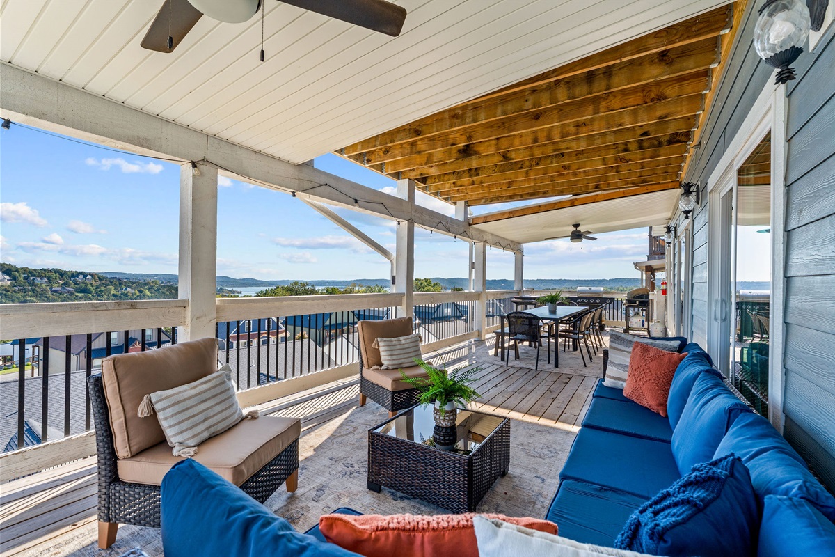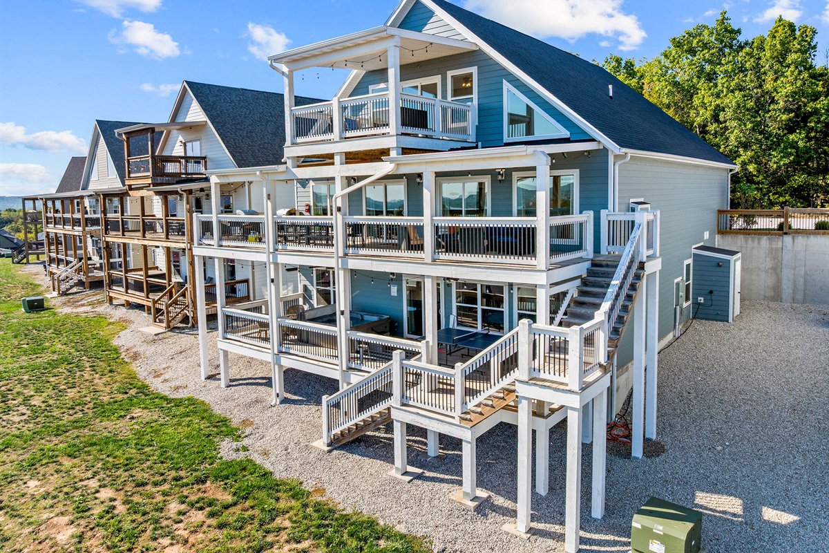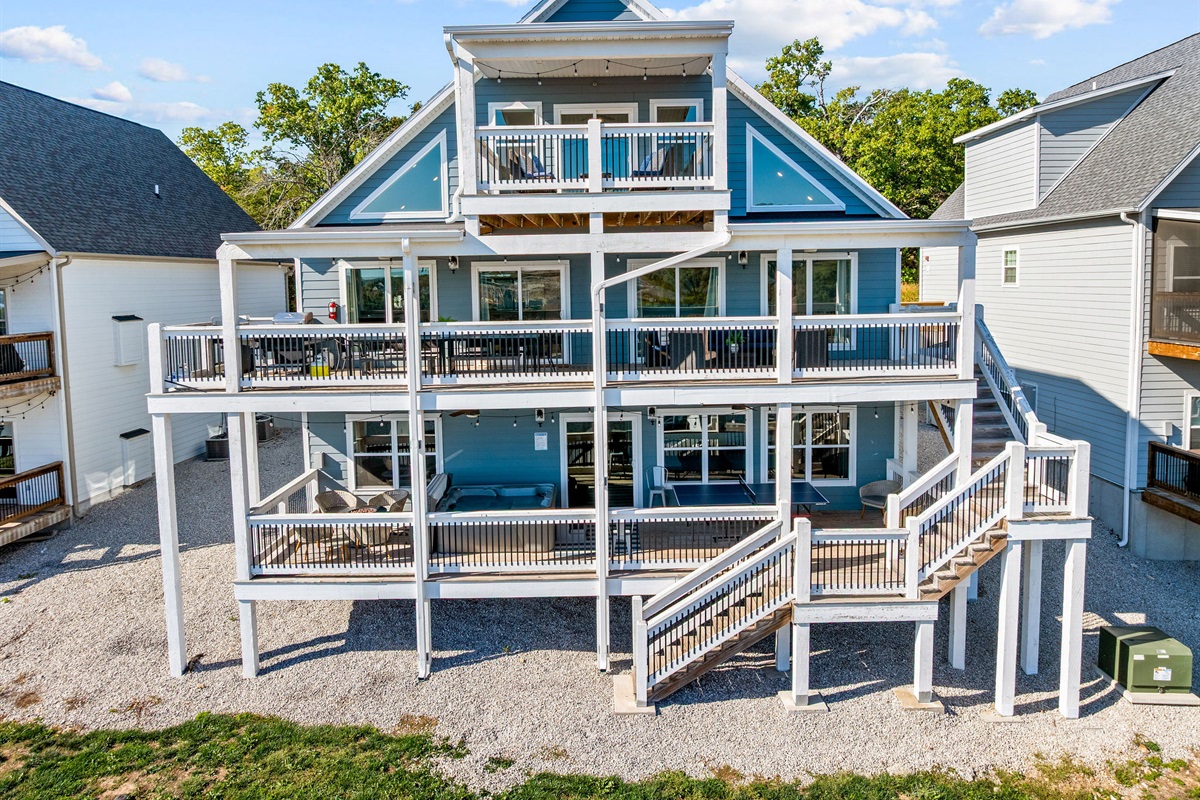 Welcome to The Cove, a stunning 3-story, 8BR / 10BA Lake view lodge with nearly 5,000 sq. ft. of upscale living space and triple-deck views of Table Rock Lake and the White River Hills of the Ozarks. Recently redesigned with a fresh, modern coastal vibe, this retreat features new furniture, décor, and artwork — plus a second living room near the game area for even more space to relax and enjoy.