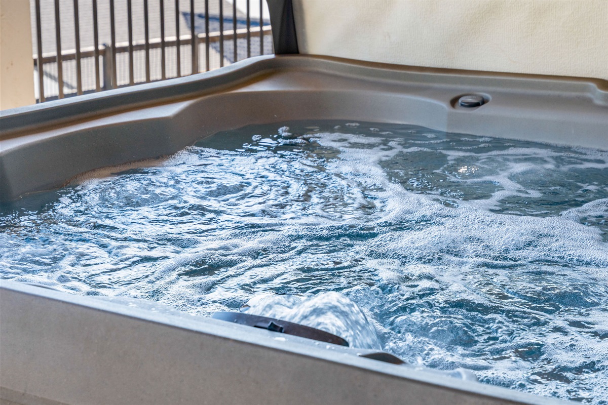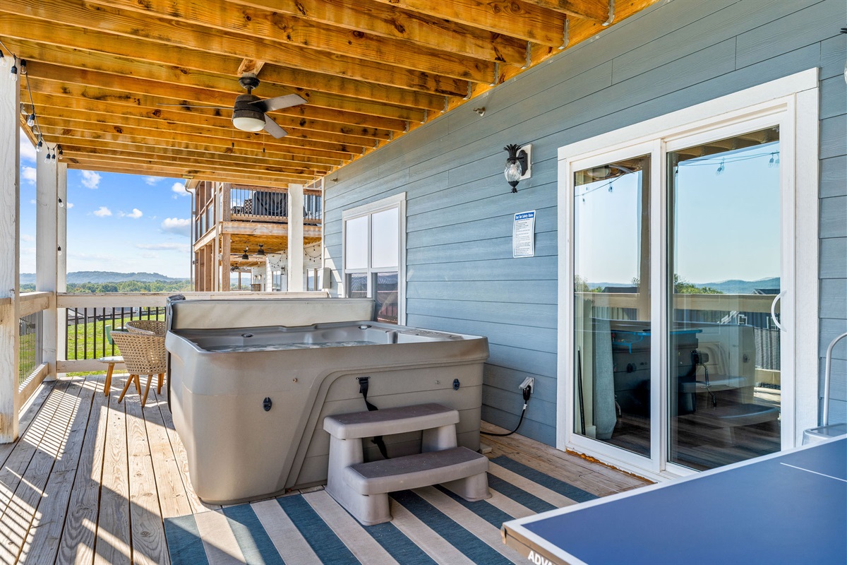- Lower Deck: Hot tub, hanging chairs & fire pit