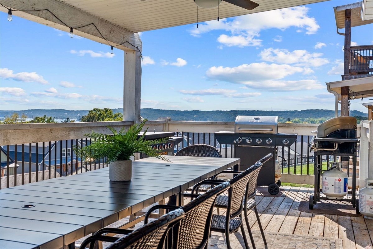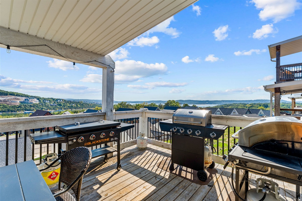 - Main Deck: Lounge seating, dining tables, two grills & griddle